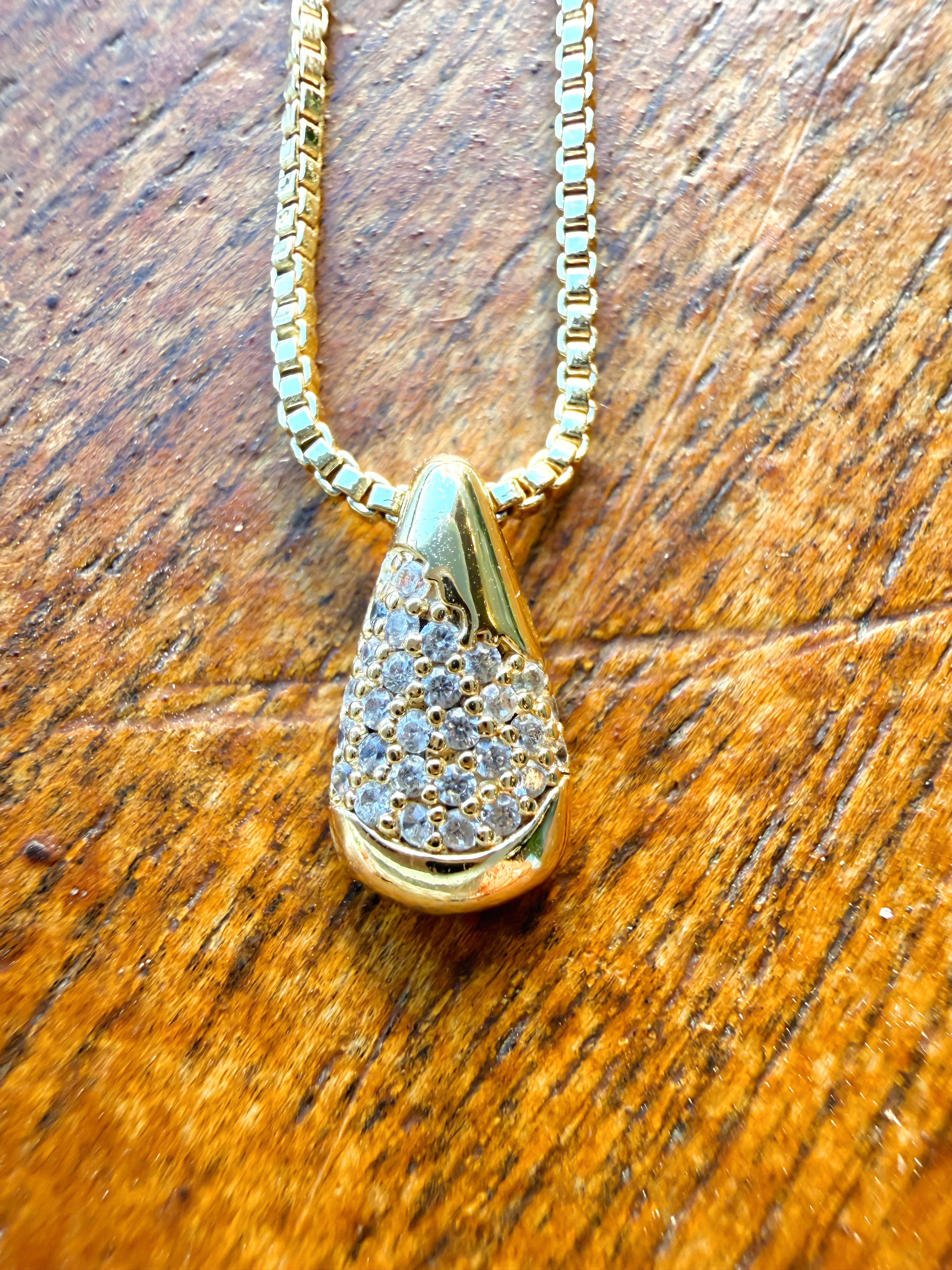 Luna Necklace Gold er et minimalistisk og tidløst halskjede med et dråpeanheng med små stener i en myk, organisk form. Stenene glitrer elegant, og gir smykket en diskret glød - som en liten dråpe med måneskinn mot huden.